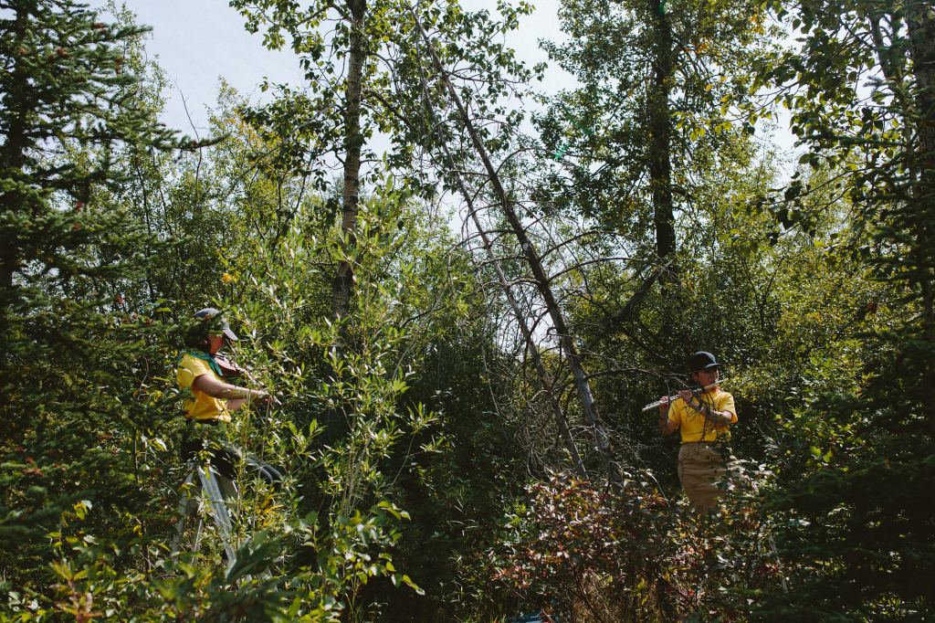 Who Cares? began their experimental classical performance perched on ladders, situated in the foliage just off the pathway on Elbow Island. As the performance unfolded, they began to traverse the landscape while playing – in recognition of the wandering nature of the event.