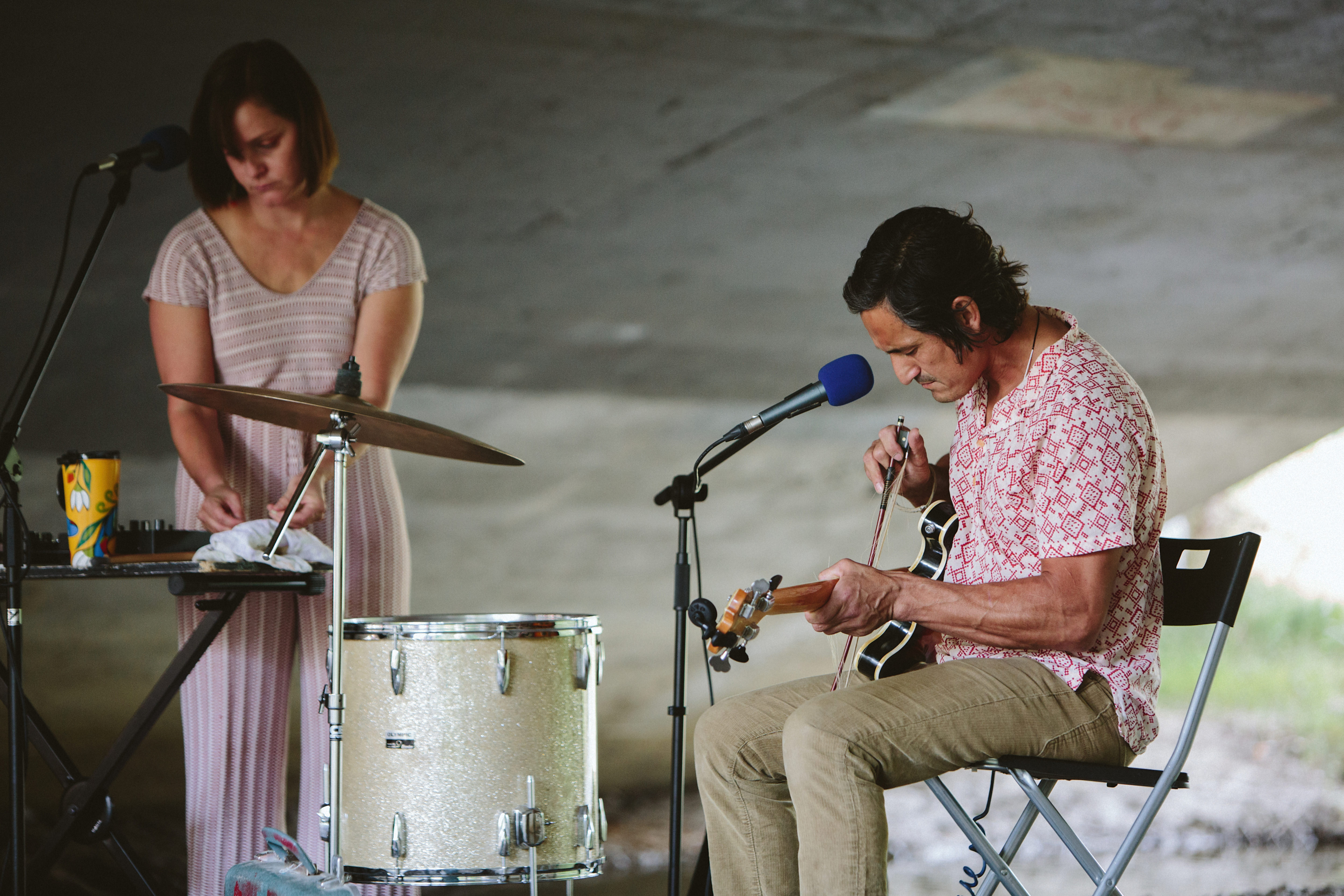 Closer to the mouth of the island, Sarah Houle & Shane Ghostkeeper used the archway under Mission Bridge to amplify their instruments.