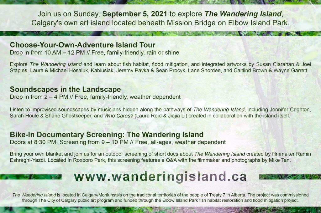 Join us for a Sunday of wandering on Calgary’s own art island, including a choose-your-own-adventure walking tour, soundscapes in the landscape, and a bike-in film screening of mini-docs about The Wandering Island art projects.